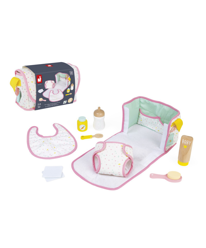 Pretty fabric nappy bag containing everything your child needs to take care of their doll: 1 bib, 1 diaper, 1 spoon, 1 brush, 1 small jar, 1 tube of cream, 1 bottle and 2 cotton pads. The bag boasts multiple inner pockets and unfolds to transform into a terry cloth changing table upon which your child can comfortably lay their doll. Wooden and fabric toy. For ages 2 years and up.