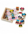 Mix and match 18 wooden pieces to create your own fashion story with Disney's Minnie Mouse! Choose a skirt, top, and even Minnie's mood for countless combinations. The puzzle pieces fit into a scene on the lid of the wooden storage box. All the pieces all store in the box. This unique dress-up puzzle helps kids three and older develop hand-eye coordination and fine motor, counting, and sorting skills, and encourages creative expression and imaginative play.