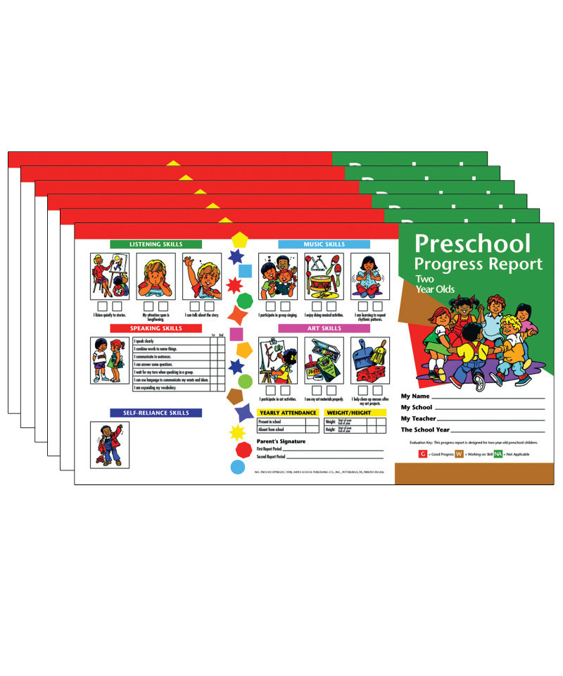 Preschool Progress Reports designed for 2 year olds provide a detailed listing of achievements in various curriculum areas. Colorful, easy-to-read Hayes reports help parents appreciate the progress their children have made. Areas include social and emotional skills, work habits, fine motor skills, gross motor skills, reading and math readiness, body parts, listening and speaking skills, self-reliance skills, music skills, and art skills. Reports are 2 sided, full-color tri-fold sheets. Closed report measures 5" x 8". Each pack includes 10 progress reports. Sold as 6 packs for a total of 60 reports.