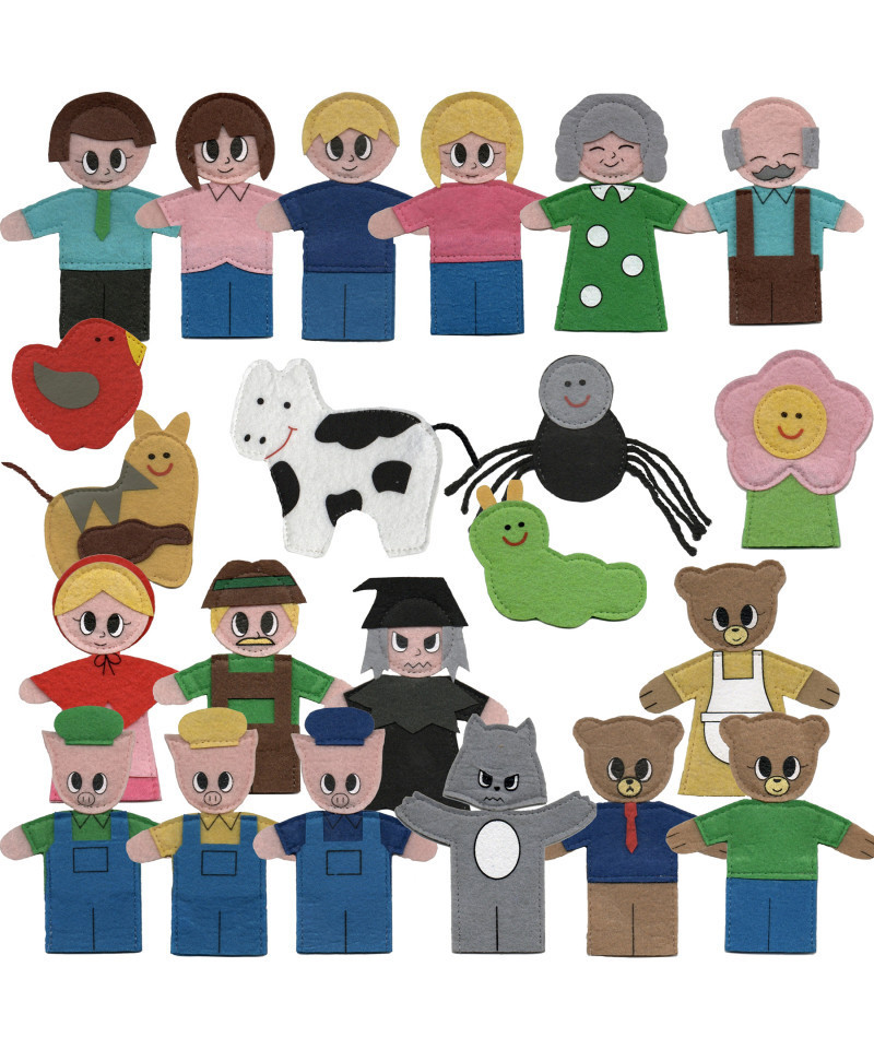 Set of 23 felt finger puppets for imaginative play and circle time activities, plus bonus CD with original recorded Nursery Rhymes that Teach Values scripts and teacher's guide. These puppets bring stories to life. Favorite characters includes popular fairy tale and nursery rhyme figures like Little Red Riding Hood, Hansel & Gretel, Three Little Pigs, and Goldilocks. Great for home, day care, library, and preschool use.