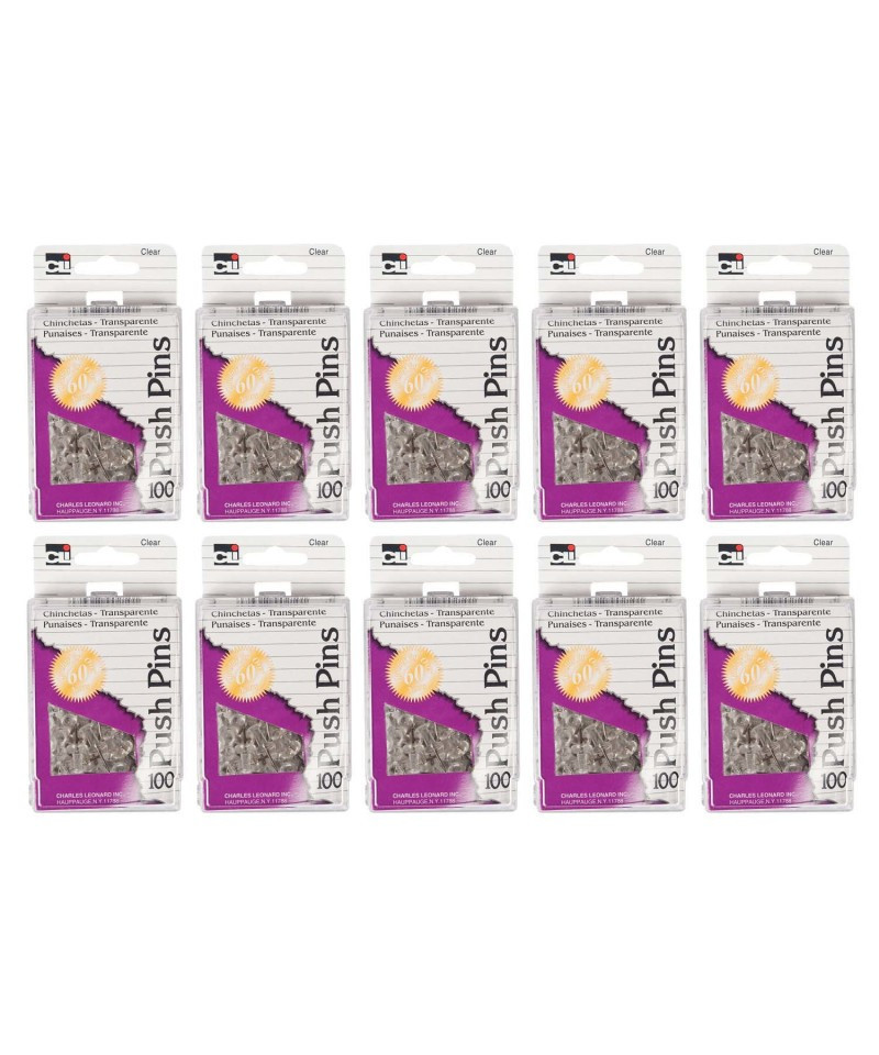 Charles Leonard Push Pins, Clear, 100 Per Box, 10 Boxes