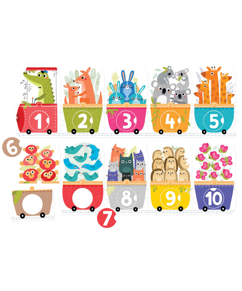 1. 2. 3. It's time for a journey to the world of numbers with the Make-a-Match Number Train Puzzle from Banana Panda! Assemble the train cars and then decide who will ride in each one. All aboard! This educational panoramic puzzle consists of 30 elements: 20 traditional pieces and 10 match-up circles. Passengers and numbered circles can be mixed and matched freely for extra fun - a great idea for creative play: learning about animals, colors and most of all – counting up to 10.