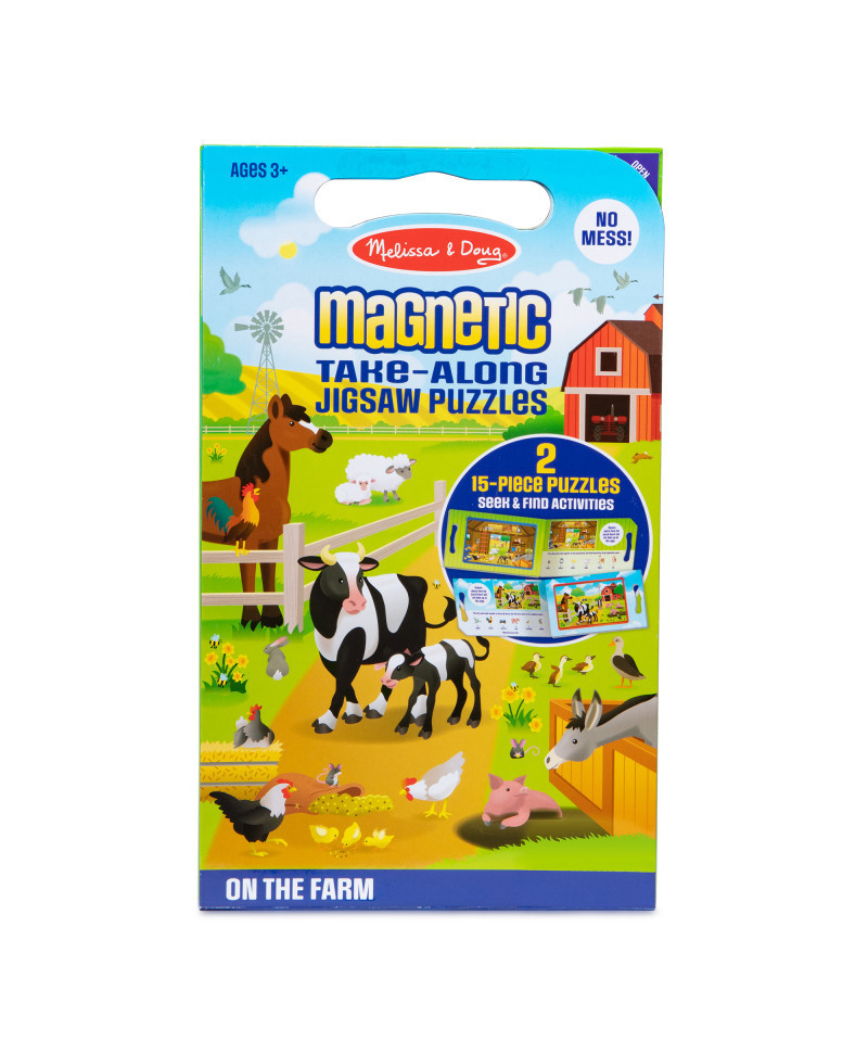- Two 15-piece farm-themed magnetic jigsaw puzzles in a compact, fold-out format