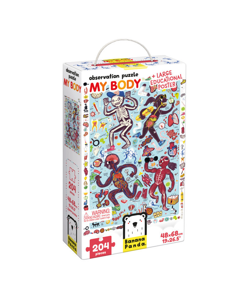 Learning anatomy has never been so fun and inspirational! This detailed educational puzzle will delight advanced puzzle lovers. First, children assemble the 204-piece puzzle (quite a challenge!), which depicts the human body's major organs and systems, and then find the 70 elements featured in the picture frame. The large double-sided poster included features lots of interesting facts about the human body. The puzzle helps expand and reinforce children's knowledge of anatomy in a comprehensive way. It is an excellent tool for training concentration and perceptiveness, encouraging kids to spend their free time creatively. Assembled puzzle measures 19" x 27".