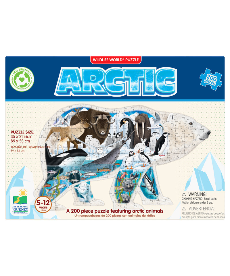 The Wildlife World Puzzle Series by The Learning Journey takes learning about Wildlife to a new level. This unique puzzle, both in shape and content, will have kids learning about natural habitats and more. This 200 piece Arctic puzzle is shaped as a Polar Bear and introduces the environment of the Arctic. This 200-piece puzzle will help develop problem solving skills, spike interest, and expand knowledge of different environments. The colors and patterns of the polar bear are beautiful and fascinating! The puzzle measures approximately 3' x 2'! Eco Friendly design is made from 70% recycled paper. Ages 5-12 years.