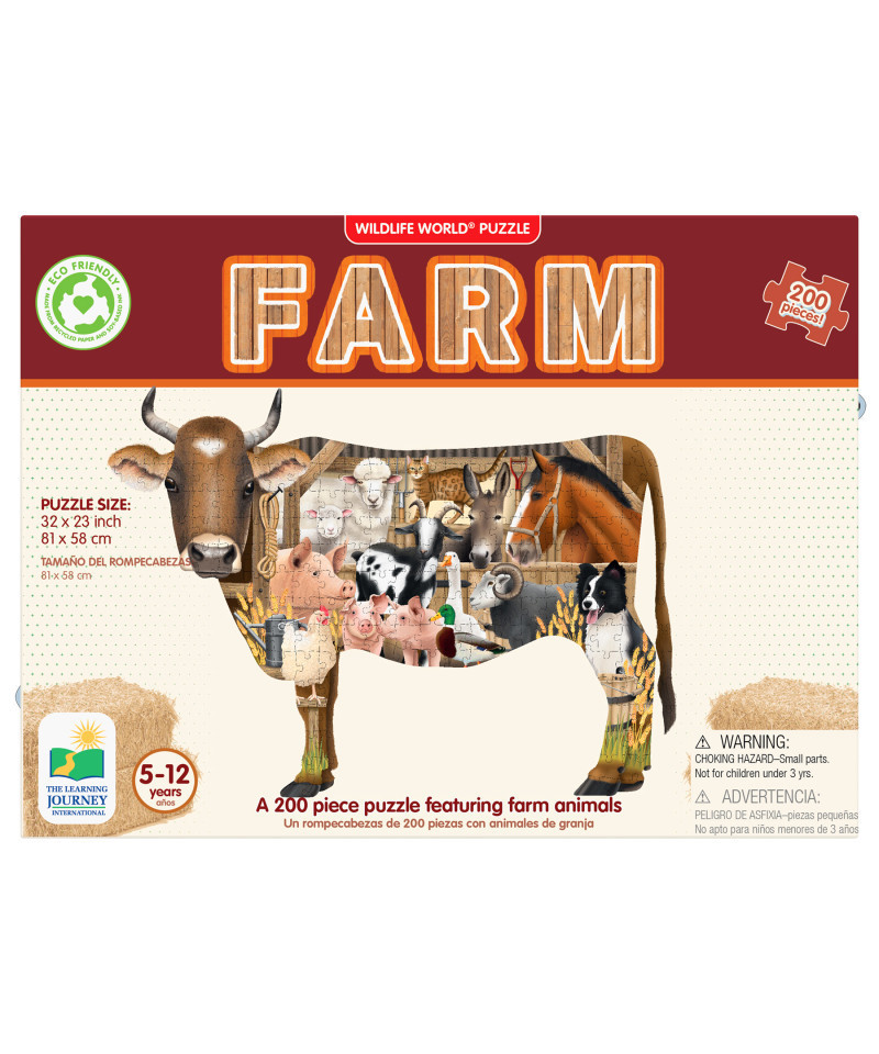 The Wildlife World Puzzle Series by The Learning Journey takes learning about Wildlife to a new level. This unique puzzle, both in shape and content, will have kids learning about natural habitats and more. This 200 piece Farm puzzle is shaped as a cow and introduces the environment on the farmlands. This 200-piece puzzle will help develop problem solving skills, spike interest, and expand knowledge of different environments. The colors and patterns of the barnyard animals are beautiful and fascinating! The puzzle measures approximately 3' x 2'! Eco Friendly design is made from 70% recycled paper. Ages 5-12 years.