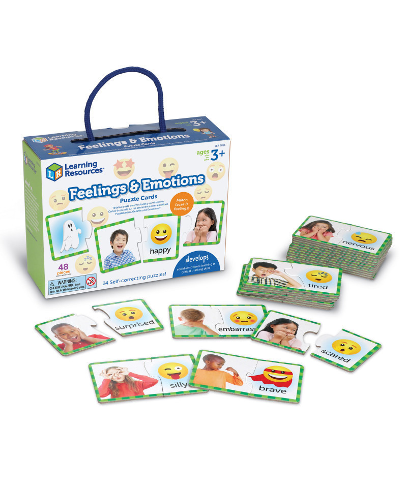 Build preschool-ready social-emotional learning skills one piece at a time! Set of 24 two-sided illustrated puzzles help kids match emotions to images. Unique puzzle shapes ensure only one right answer. Box doubles as a reusable storage and carrying case!