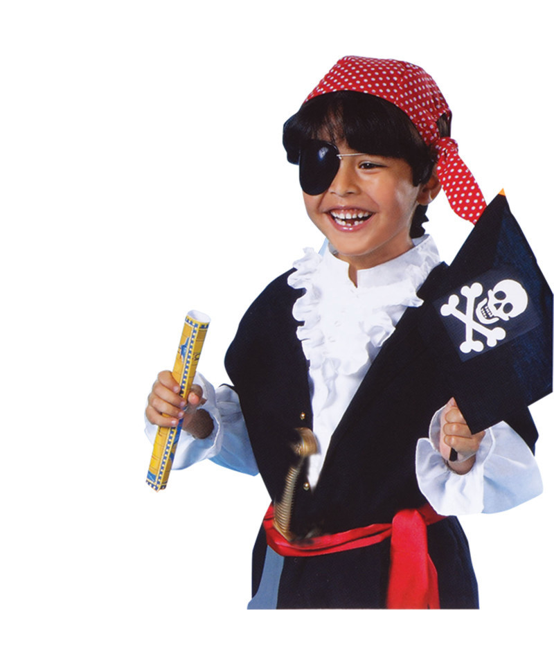 - Complete Pirate Set – Includes coat, pants, turban, treasure map, belt, pirate flag, eye patch, and pretend dagger.