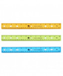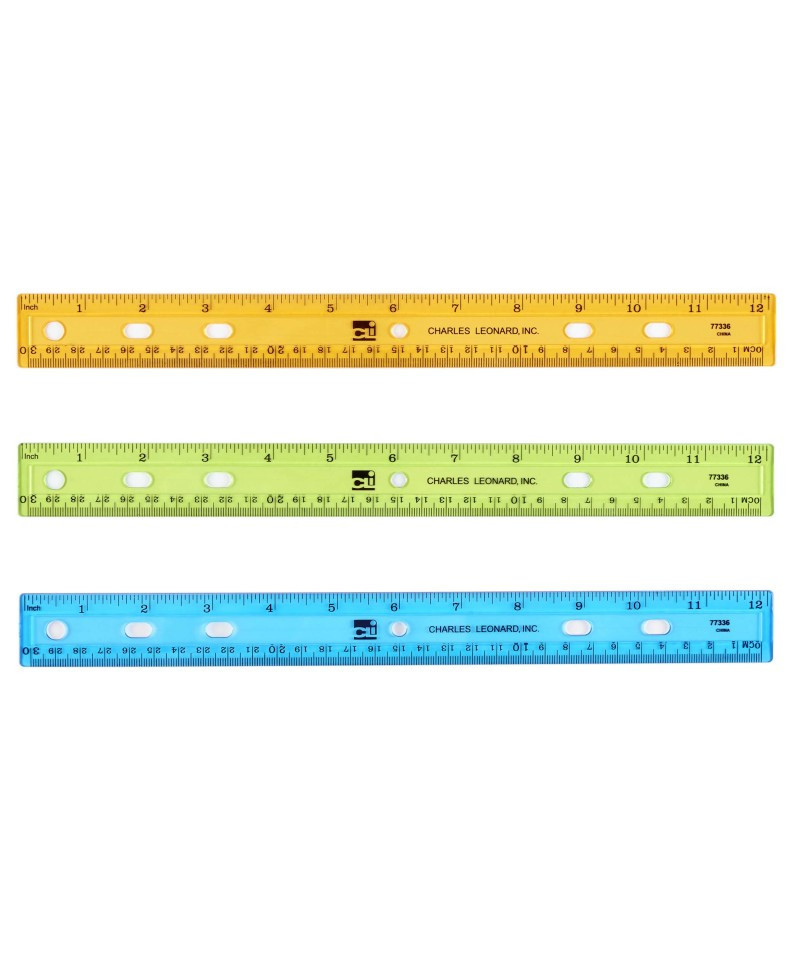 Durable plastic rulers feature double beveled edge with pencil groove. Raised calibrations show 1/16 inches on one edge, millimeters on the other. Holes allow for storage in ring binders. Assorted colors. Let us choose your color. Sold as a pack of 48 rulers.