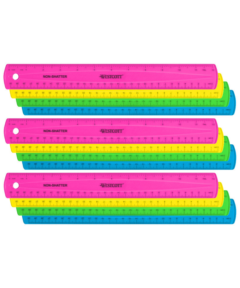 Westcott® offers a wide range of anti-microbial products that contain an antimicrobial agent to help inhibit the growth of bacterial stains and odors. Westcott® Drafting & Drawing Tools are some of the finest products of their kind for students and professionals. Our commitment to meticulous quality and cutting edge innovation in measurement and art materials has earned an unparalleled reputation. This 12" Shatterproof Ruler features total flexibility and clarity of measurement. Bend this flexible ruler and it returns to its original shape. Translucent color allows for viewing through to the page. Scaled Metric & 1/16th and includes hang hole for convenient storage. Suitable for use in the home, school, shop or office. Sold as a pack of 12 in assorted colors (no color choice).