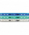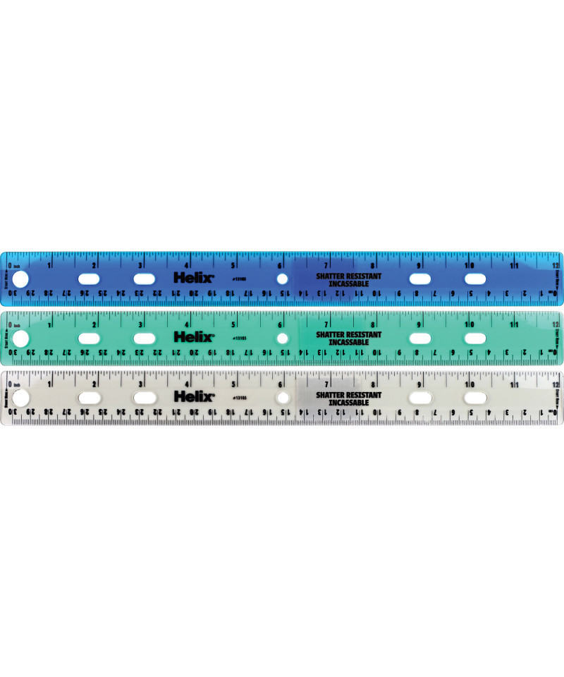 Classic 12" / 30cm Ringbinder ruler, now made safer with Shatter-Resistant material! Unlike standard rulers that create dangerous shards of plastic when bent or broken, our Shatter-Resistant material is much safer if the ruler is broken, making it ideal for young students. And the translucent body means you can easily see what you are measuring for better accuracy with both Metric and Inch graduations printed clearly on the ruler. Integrated ringbinder holes and a large hang hole make this ruler easy to transport and store! Comes in assorted colors: Teal, Blue and Gray (no color choice).
