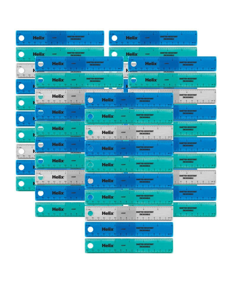 Classic 6" / 15cm ruler, now made safer with shatter-resistant material! Unlike standard rulers that create dangerous shards of plastic when bent or broken, our shatter-resistant material is much safer if the ruler is broken, making it ideal for young students. And the translucent body means you can easily see what you are measuring for better accuracy with both Metric and Inch graduations printed clearly on the ruler. Integrated hang hole make this ruler easy to transport and store! Sold as a pack of 50 in assorted colors: Teal, Blue and Gray (no color choice).