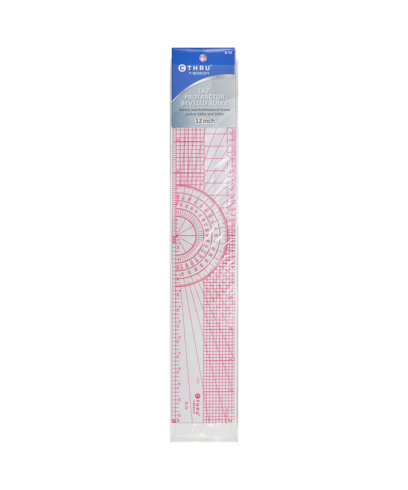 The Westcott Beveled Protractor Ruler is a versatile tool measuring 12 inches, designed for precise and smudge-free inking. It features calibrated scales in 16ths to the inch, centimeters, architects' scale, and tenths to the inch, as well as 8ths and tenths graph sections for added convenience. Laminated for durability, this ruler is translucent in color, allowing for easy viewing through to the page, making it perfect for all your drafting and drawing needs.