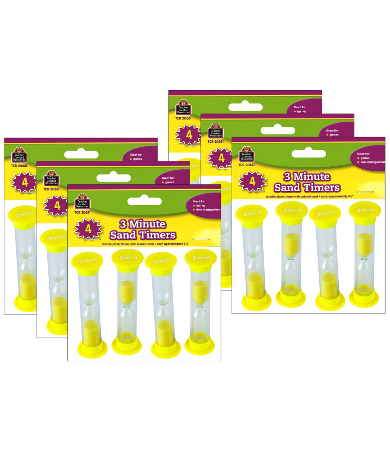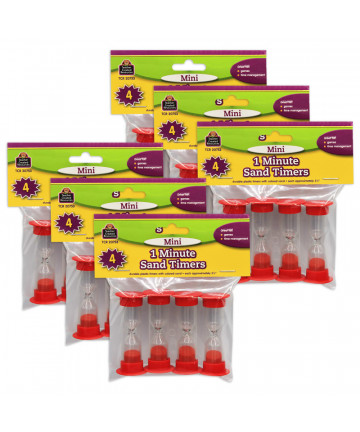 Race to see how much can be accomplished before time runs out. Great for games, timed test, and time management. Handy plastic timers with colored sand. Includes suggested activities. Each timer measures 1" x 3.5". Each pack includes 4 timers. Sold as 6 packs for a total of 24 timers.
