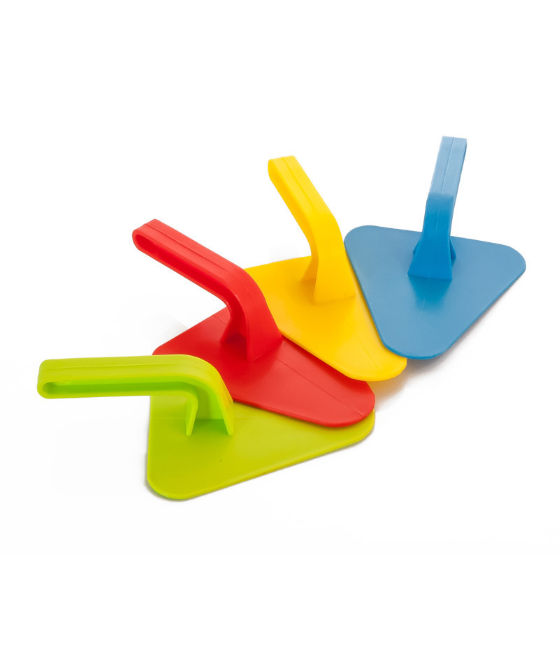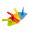 This is a set of 4 trowels that are made of strong and resilient plastic and can be used in sand and snow. They come in four bright colors which include red, green, yellow and blue.