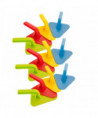 This is a set of 4 trowels that are made of strong and resilient plastic and can be used in sand and snow. They come in four bright colors which include red, green, yellow and blue. Sold as 3 trowel sets.