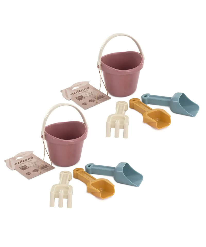 - Each ECO Baby Sand Set in pastel colors includes a bucket, shovel, dustpan and rake.