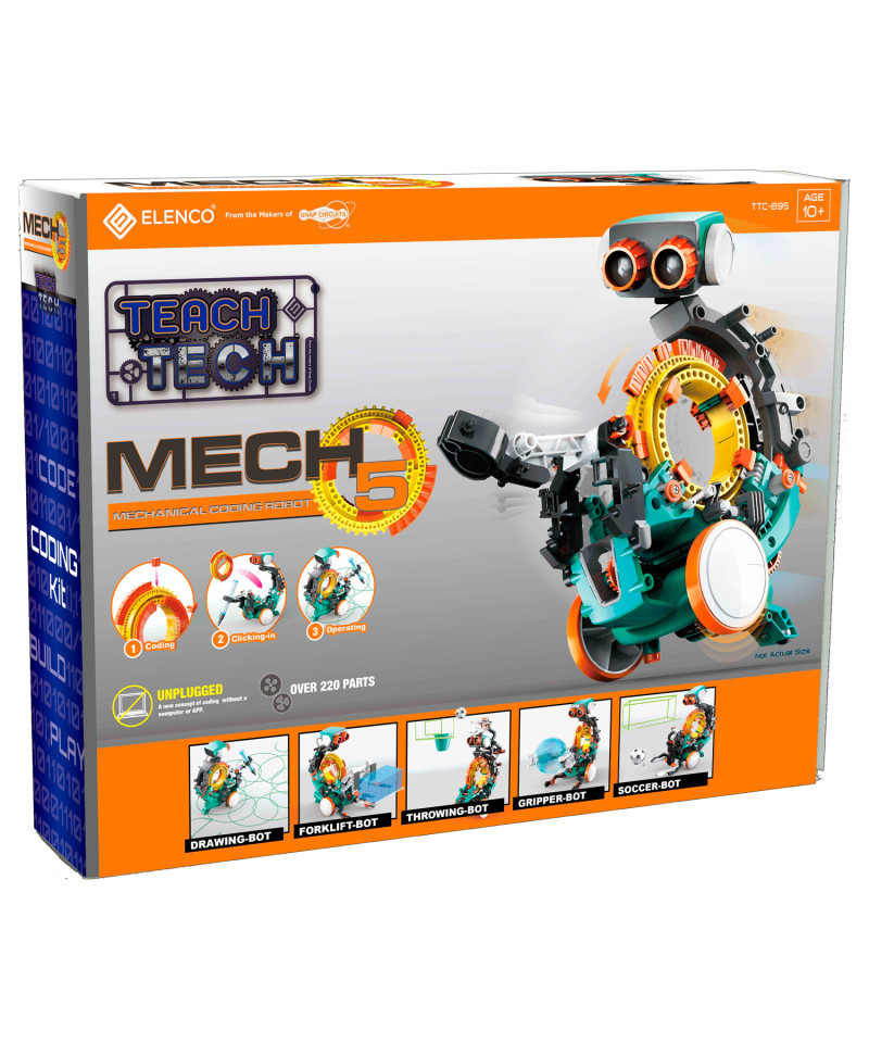 The mechanical coding wheel is the heart of the Mech-5 Mechanical Coding Robot. It steers its coded courses and programmed tasks. Coding is executed effortlessly by snapping the coding buttons onto the coding wheel, directing your robot to perform its basic functions – move forward, backward, right or left, spin or pause. Thanks to this simple to follow approach, coding and performing more challenging tasks like throwing, lifting, kicking or drawing, become achievable as the user’s coding skills increase.
