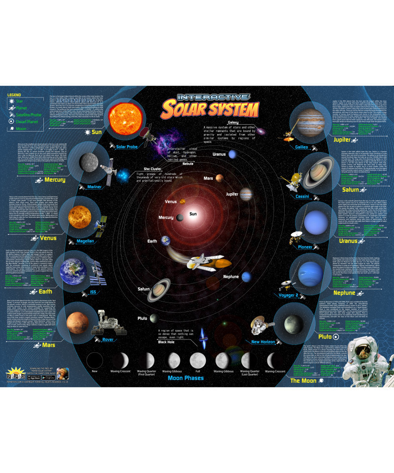 Popar brings the Solar System to life through an interactive Augmented and Virtual Reality infused laminated smart chart. Connect and play with the Solar System through stunning animations, thought provoking game, educational read-alongs, and so much more! All Popar smart charts are designed with these key features to support and help your child enhance creative perception, learn about spatial and temporal concepts, and build listening comprehension. Chart measures 42" x 32".
