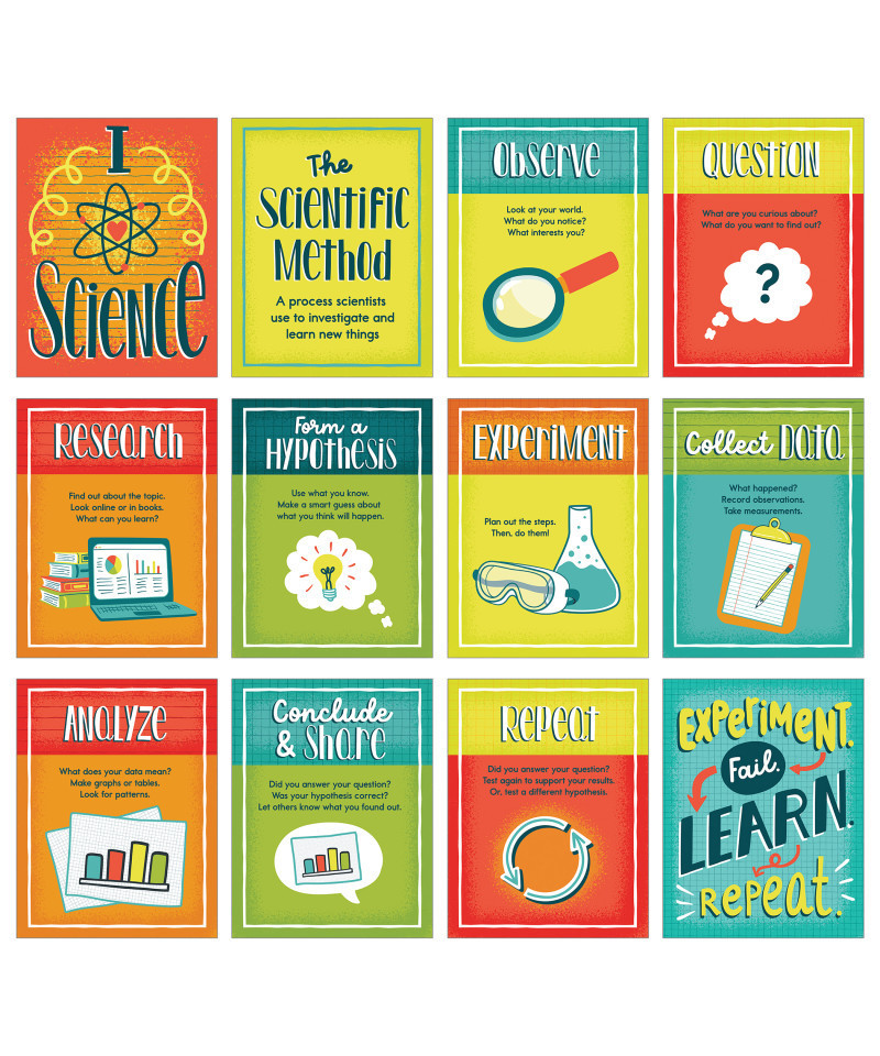 - Colorful and easy-to-understand posters describe the steps of the scientific method and encourage exploration