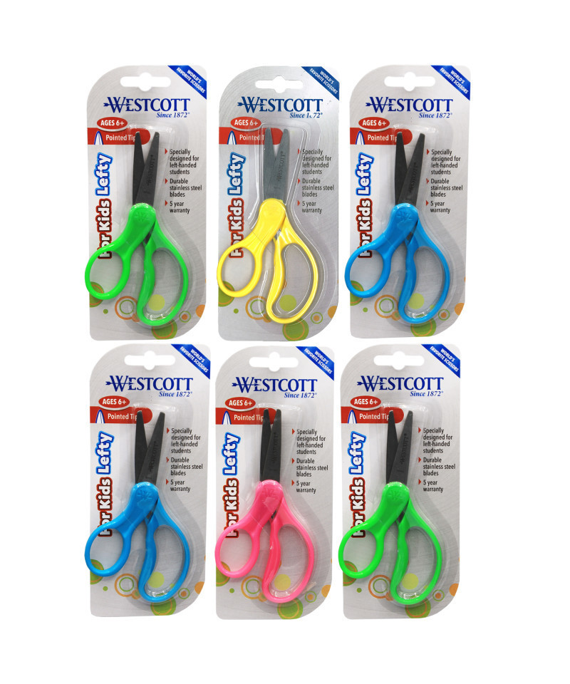 Westcott has provided the world with innovative and well designed products for over a century... at affordable prices, without sacrificing quality. Westcott is dedicated to supporting education and inspiring creative activities in the classroom and at home. Products are specifically designed for growing students, created to be fun and functional with superior quality and exceptional value. These Westcott For Kids Scissors are specially designed for left-handed use. Extra strong and durable stainless steel safety blades. Easily cut through paper, fabric, string and other craft materials. 5" Pointed. Sold as a pack if 6 in assorted colors (no color choice).