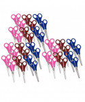 Easy to hold scissors for small hands. Stainless steel blades with molded plastic handles. Universal design is ideal for both right and left handed use. Blunt tip, sold in red, blue and fuchsia (no color choice). Pack of 36 scissors.