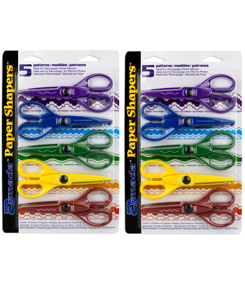 Paper Shaper® decorative scissors will cut unique shapes and borders. They are great for scrapbooks, stationery, paper crafting, and much more! Paper Shapers are made with comfortable and sturdy molded plastic handles and have stainless steel blades. This set comes in a blister pack with 5 scissor designs: Victorian, Inchworm, Wave, Pinking and Heartbeat. Sold as 2 sets for a total of 10 scissors.