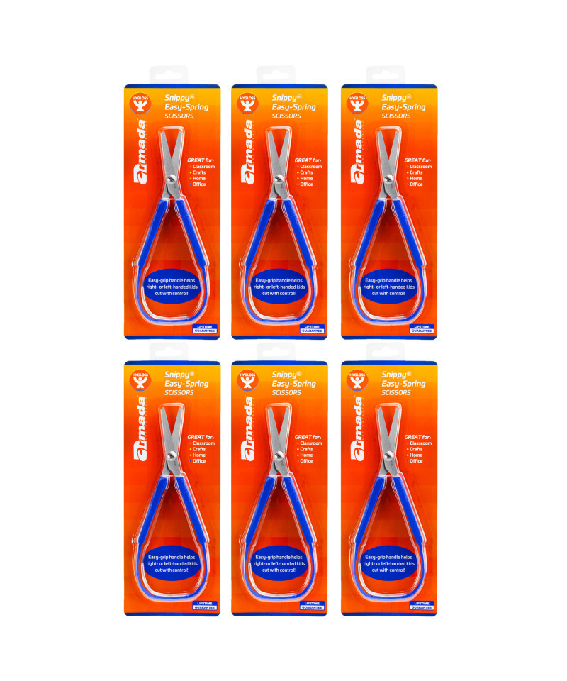 Our Snippy® Spring Scissors are ideal for adults with special needs or children who are developing motor skills. The stainless steel blades are attached to a plastic handle. The flexible plastic loop springs open after a cutting motion. Simply squeeze gently using the thumb and fingers or the fingers and palm of the hand. Designed for right or left handed use. Sold as a pack of 6.