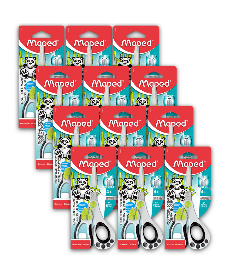 Koopy scissors are ideal for learning how to cut because of the spring-assisted automatic blade opening system. In addition, their rounded blade tips mean they're safe for small hands! Made with stainless steel blades and ergonomic handles. Assorted clip colors (no color choice). Pack of 12 scissors.