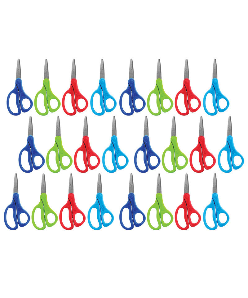 Maped Essentials Kids School Scissors are perfect for young students going back to school! Modern 5" / 13cm design features Pointed Tip Stainless Steel Blades with a rounded tip that is safer others you can find on the market and are much more appropriate for young students. Eye-catching asymmetrical handles are perfect size for young hands to hold, and are perfect for students 6+ years old. Sold as a pack of 24 in assorted colors: Blue, Light Blue, Red and Green (no color choice).