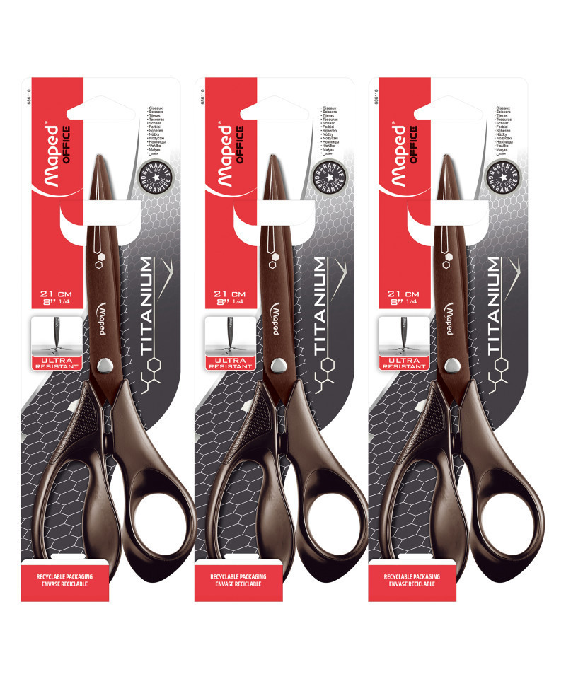 High performance cutting with heavy duty titanium 2.4mm blades for increased resistance to wear and tear, up to 3 times as strong as standard steel. Corrosion resistant. Ergonomic handles made of 79 percent recycled plastic. Lifetime warranty. Sold as a pack of 3 pairs of scissors.
