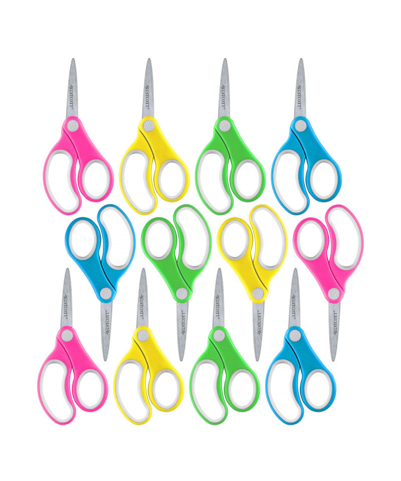 Westcott scissors feature stainless steel blades and comfortable soft handles that are suitable for left-handed and right-handed children. 5" Pointed Scissors are specially designed for a child's hand. An inside grind on the stainless steel blades mean they are accurate and dependable. These scissors cut easily through paper, fabric, string, and other craft material. Westcott is dedicated to supporting education and inspiring creative activities in the classroom and at home. Products are specifically designed for growing students, created to be fun and functional with superior quality and exceptional value. For ages 6 and up. Sold as a pack of 12 in assorted colors (no color choice).