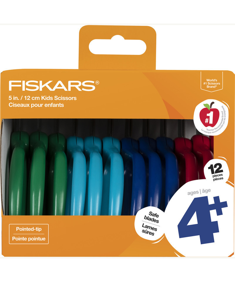 Fiskars® Pointed tip Kids Scissors Classpack contains 12 scissors with safety-edge blades and comfortable handles. Scissors feature handles designed just for kids, as well as innovative, safety-edge blades with a safer blade angle. Pointed tip allows for improved detail cutting of all classroom materials. Larger finger loop and an ergonomic thumb loop provide a natural, more comfortable fit for kids’ fingers. Optimized opening angle helps kids comfortably open the blades without losing their grip, ultimately offering better control.