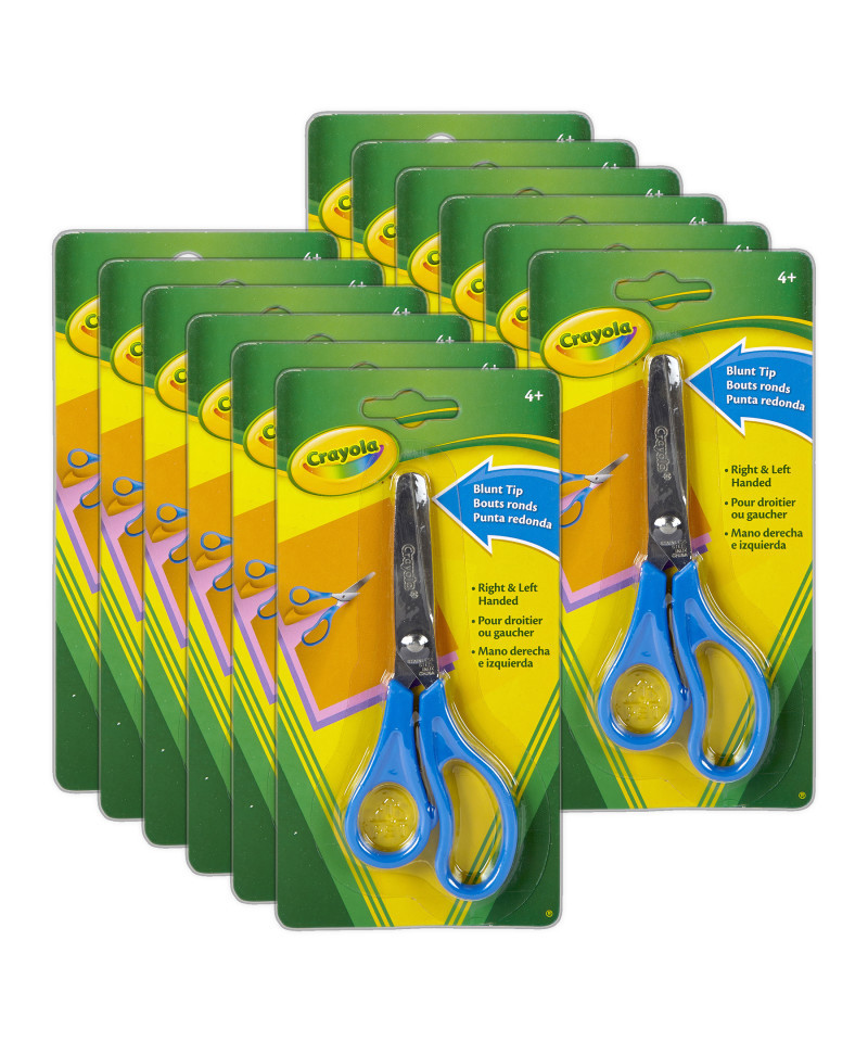 Get kids crafting with high-quality stainless steel scissors designed for safety. Fun colored handles and specially designed rounded tips, are just some of the details that make this scissor a crafting essential. These child safe scissors have comfortable, yet durable handles that are appropriate for right- and left-handed children. They are perfect for school crafts, homework assignments, projects, and at-home creative fun. Pair them with Crayola construction paper and glue (each sold separately) for a great bundled gift idea. It's time for afternoons filled with DIY crafts and unlimited creative possibilities! Stock up classrooms and craft rooms with durable, safe scissors for kids, ages 4 and up. Pack of 12 scissors.