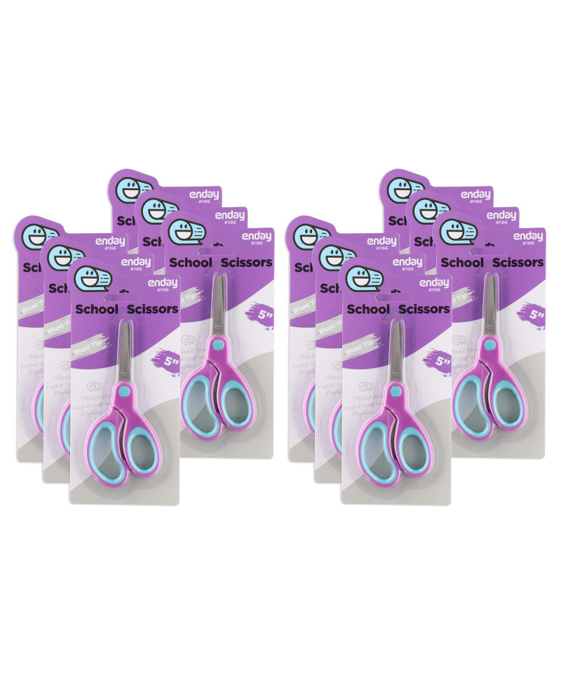The 5" Blunt Tip School Scissors pack is a must-have for both home and office use, offering precision, durability, and comfort for everyday cutting needs. Designed with titanium-enhanced stainless-steel blades, these scissors deliver clean, smooth cuts and maintain sharpness longer, making them perfect for cutting paper, cardboard, and fabric. The soft-grip handles are ergonomically designed with large finger holes, ensuring a comfortable and secure grip for both left- and right-handed users. Durable and reliable, these scissors are crafted for versatile use while maintaining safety with their blunt-tip design, making them especially suitable for school projects and arts and crafts activities. With high-quality materials and thoughtful features, these scissors combine functionality and ease, making them an excellent choice for a variety of cutting tasks. Sold as 2 packs. Each pack includes 6 scissors.