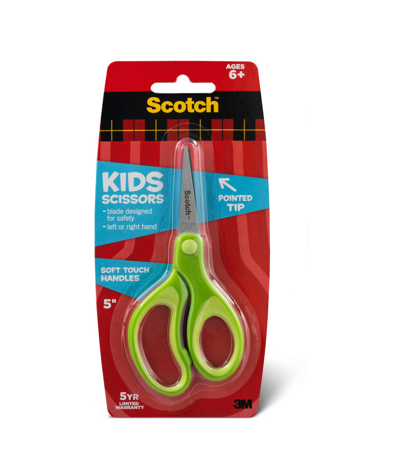 Scotch 5" Soft Touch Blunt Tip Kids Scissors feature a soft grip handle made for small, growing hands. Designed for safe right and left-handed use for all kids. Scotch Kids Scissors cut precisely, making them great for a variety of kid-friendly school projects– they are a must-have on your school supplies list for back-to-school. Easy to use at home for enriching supervised activities and crafts. Safe for the classroom, Scotch Kids Scissors feature quality stainless steel blades with a sharp edge, pointed tip, and long cutting life. Cuts through paper, card stock, tape, foam, pictures and more. The best projects start with Scotch Brand Scissors.