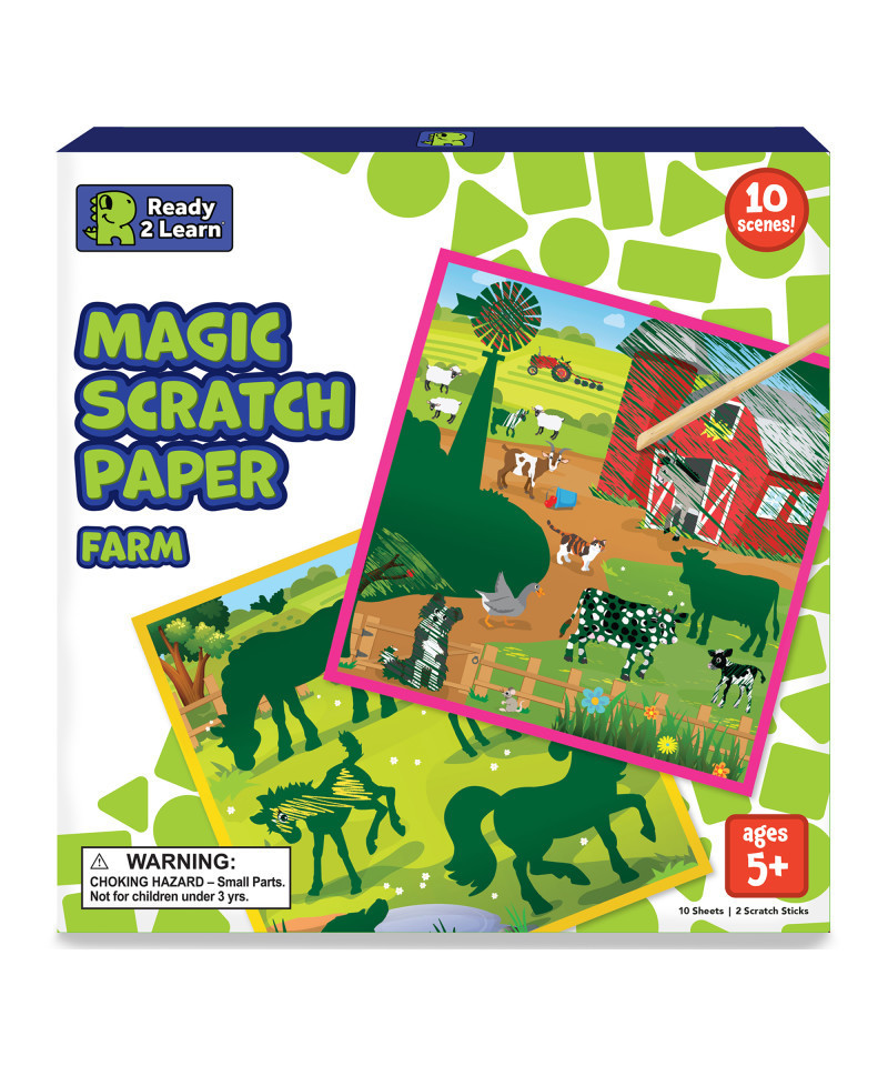 - 10 SCENES -- This scratch art kit features 10 different activity boards. Use the 2 bamboo scratch sticks to reveal vibrant, farm scenes!