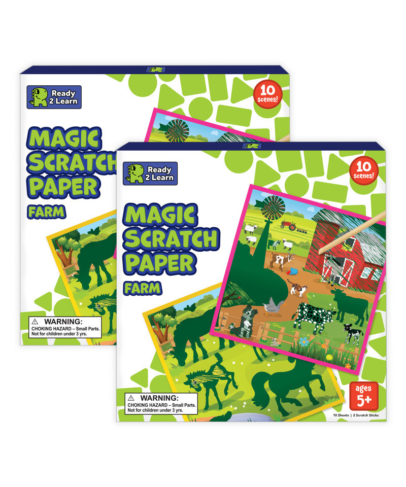 - 10 SCENES -- This scratch art kit features 10 different activity boards. Use the 2 bamboo scratch sticks to reveal vibrant, farm scenes!
