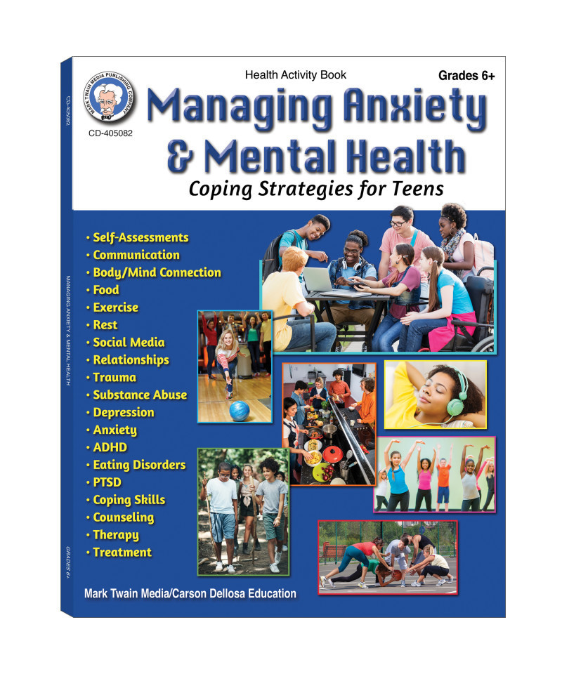 Help your teen understand and manage their physical and mental health with the activity-packed Mark Twain Managing Anxiety & Mental Health: Coping Strategies for Teens Workbook! Mental health books are a great way for children to learn about and manage anxiety, depression, and overall health and wellness through focused lessons and practice. The 64-page mental health workbook features engaging and informative social emotional learning activities, including anxiety relief for teens, anger management for kids, positive thinking, ADHD, depression, social media, health and wellness, and social skills for teens. Great for both classroom or homeschool curriculum, the anxiety workbook also includes self-assessments and a guided journal section for students to practice their critical thinking skills while reflecting on their own thoughts and feelings.