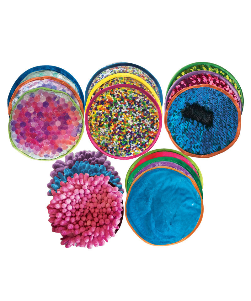 Captivating, soothing tactile and visual sensory experiences for early learners or those with special needs are delivered with these 5" diameter Sensory Discs. Also perfect for fidgety students, these discs are made for touching, squeezing, exploring and observing! This set includes all 5 sensory disc sets: Scaly Stuff, Squishy Stuff, Squeezy Stuff, Fuzzy Stuff, and Hidden Stuff. Each set includes 3 discs for a total of 15 sensory discs.
