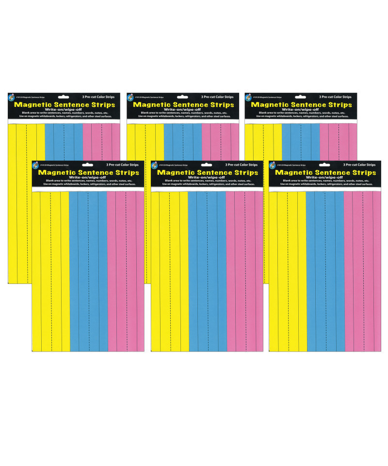 Great for use in the classroom or at home! Use on magnetic whiteboards, steel lockers, refrigerators, or any magnetic surface. Write-on/wipe-off with dry erase markers or liquid chalk markers! Each strip measures 2.75" x 11". Each pack includes 3 magnetic sentence strips, 1 each of pink, blue, and yellow. Sold as 6 packs for a total of 18 sentence strips.