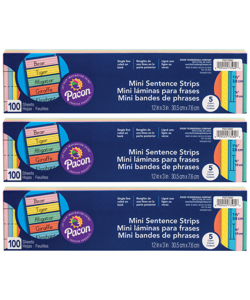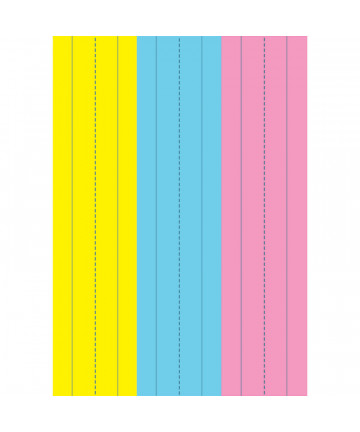 A 3" x 12" version of traditional sentence strips that are perfect for one or two words. These strips are ruled 1 1/2" with 3/4" dotted midline on one side, and single line ruled on the opposite side. There are 100 strips per film-wrapped package. Assortment includes five colors: Canary, Orange, Pink, Green and Blue. Recyclable. Sold as 3 packs for a total of 300 sentence strips.