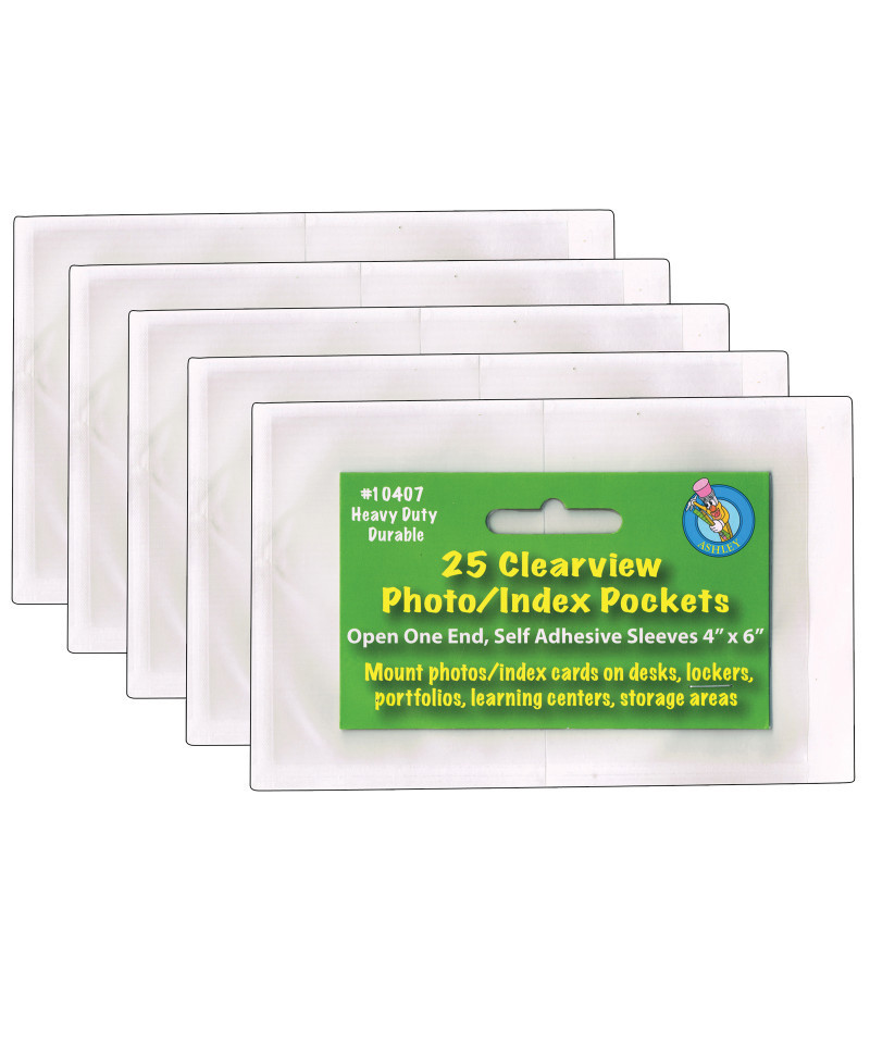 These pockets seal at end and remove easily from desk. Self-adhesive and heavy duty. Open pocket, slip in picture/card, remove backing, position pocket and stick! Each pocket measures 4.5" tall by 7" wide. Each pack includes 25 pockets. Sold as 5 packs for a total of 125 pockets.
