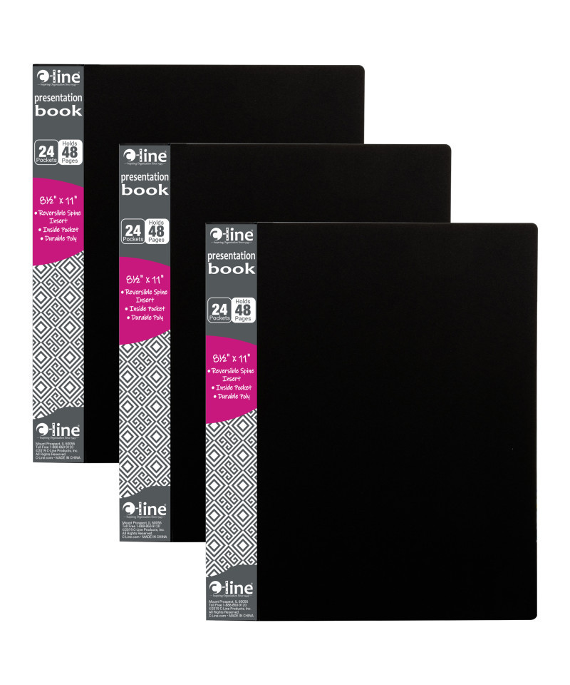 Present your report, project or artwork in style with this presentation book. Features twenty-four bound-in clear top-loading polypropylene sheet protectors that lie flat while the book is open. Storage pocket on inside front cover holds extra materials. Clear-view spine insert is reversible for instant customization. Acid-free. Black. Sold as a pack of 3 books.