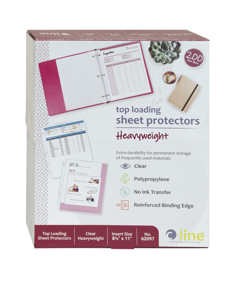 Our most economical heavyweight sheet protector! Extra durable heavyweight sheet protectors provide permanent storage for frequently used materials. Measures 11" x 8 1/2". Photocopies won't stick. No sheet punching necessary. Acid-free. Clear finish. Box of 200.