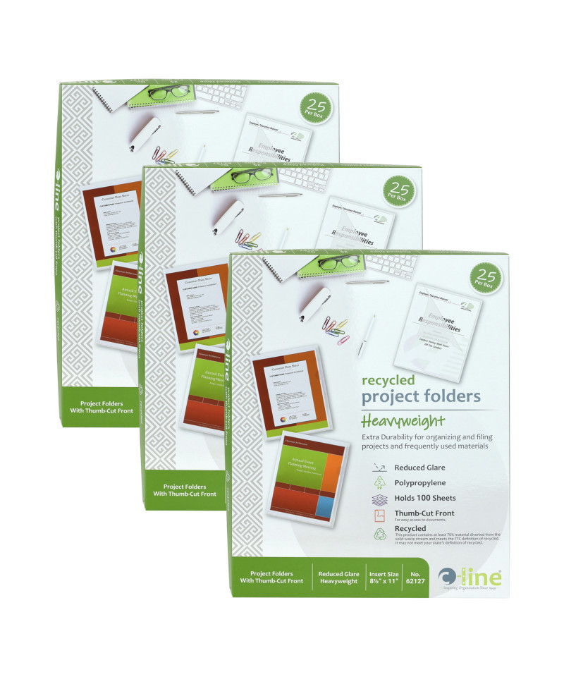 Strong, tear-resistant recycled polypropylene folders divide, organize and color code your many projects. Use by themselves or to subdivide file folders. Sealed on two sides, each folder is made for easy loading and access. Polypropylene means no photocopy transfer-safe protection for your hard work. For 8 1/2" x 11" materials. Clear. Each box includes 25 folders. Sold as 3 boxes for a total of 75 folders.