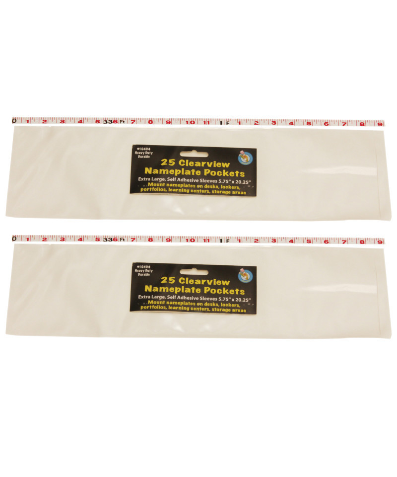 These pockets seal at end and remove easily from desk. Self-adhesive and heavy duty. Open pocket, slip in nameplate, remove backing, position pocket and stick! Each pocket measures 5.75" tall by 21" wide. Each pack includes 25 pockets. Sold as 2 packs for a total of 50 pockets.
