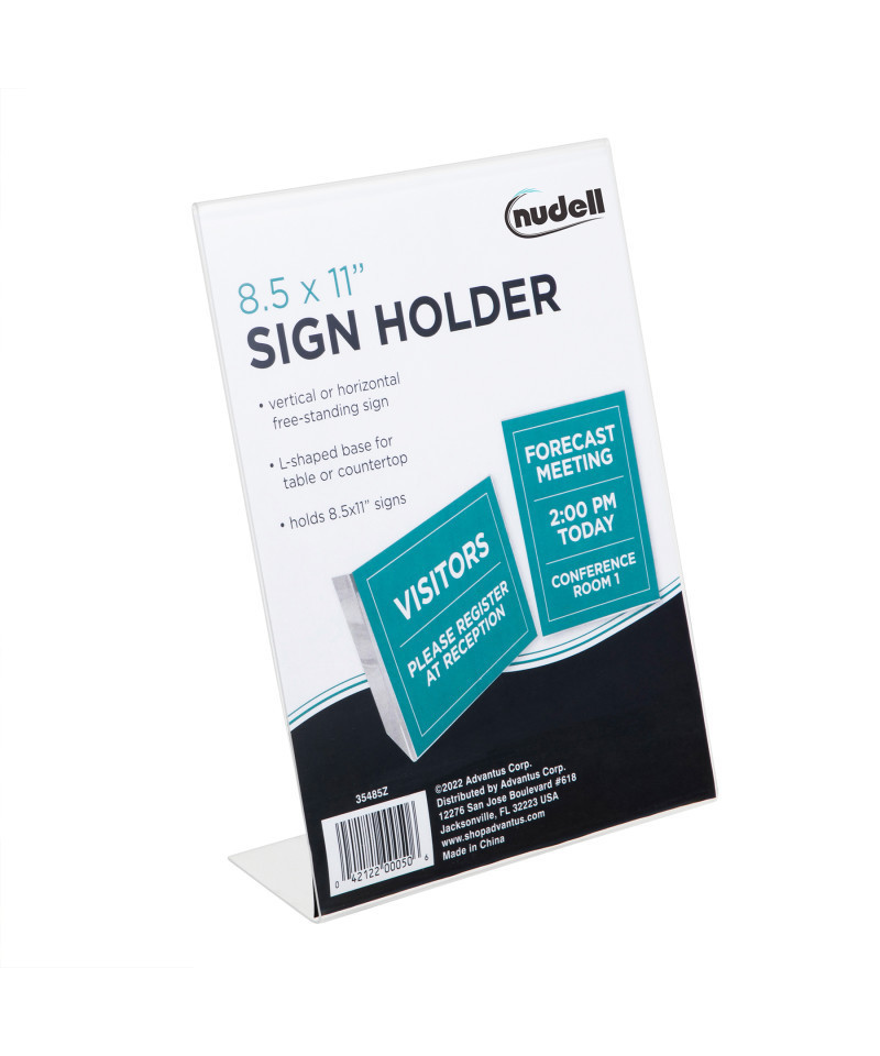 Nudell sign holders are perfect for displaying signs, pictures, notices and more. Single-sided sign holder forms its own stand with a slanted shape design. Table or countertop friendly, it works vertically and horizontally. Features easy-to-clean resin that can be wiped clean with a damp cloth.