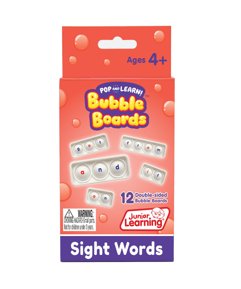 Set includes 12 double-sided Bubble Boards covering 24 most common sight words. Children will enjoy popping beginning, middle and final sounds as they pop out words. Consonants are color-coded in blue, short vowels in red. All word examples are decodable, where each bubble represents a phoneme. Ages 4+.