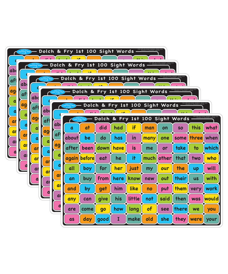 Smart Poly™ material has been designed for the classroom and home. The material is strong, durable, water resistant, and does not need lamination. The Sight Words learning mat features Dolch & Fry Level 1 and 2 words (200 total sight words). Heavy duty double-sided surface for fun and colorful learning on both sides. Write-on/wipe-off surface. Use with dry erase or water based markers and washable crayons. Each side is an interactive lesson. Mat measures 12" x 17". Sold as a pack of 6 learning mats.